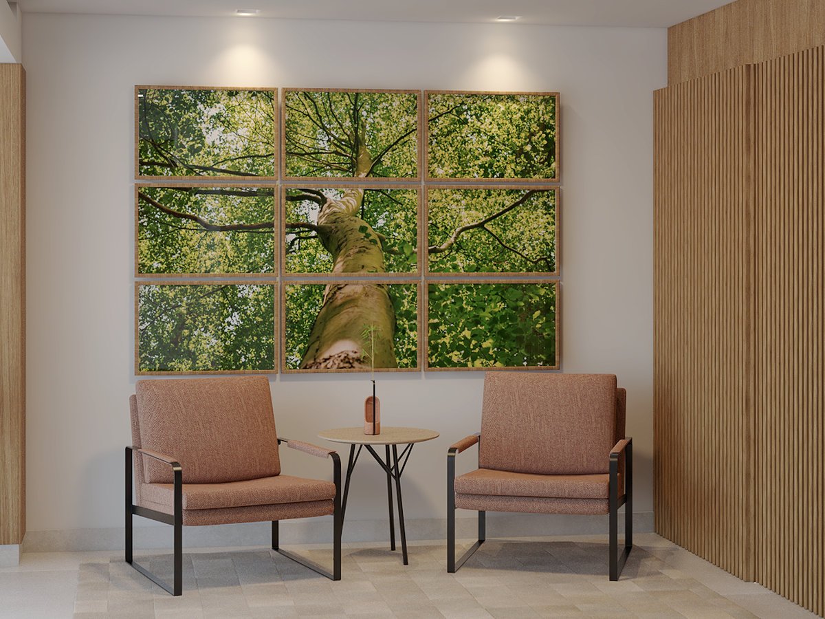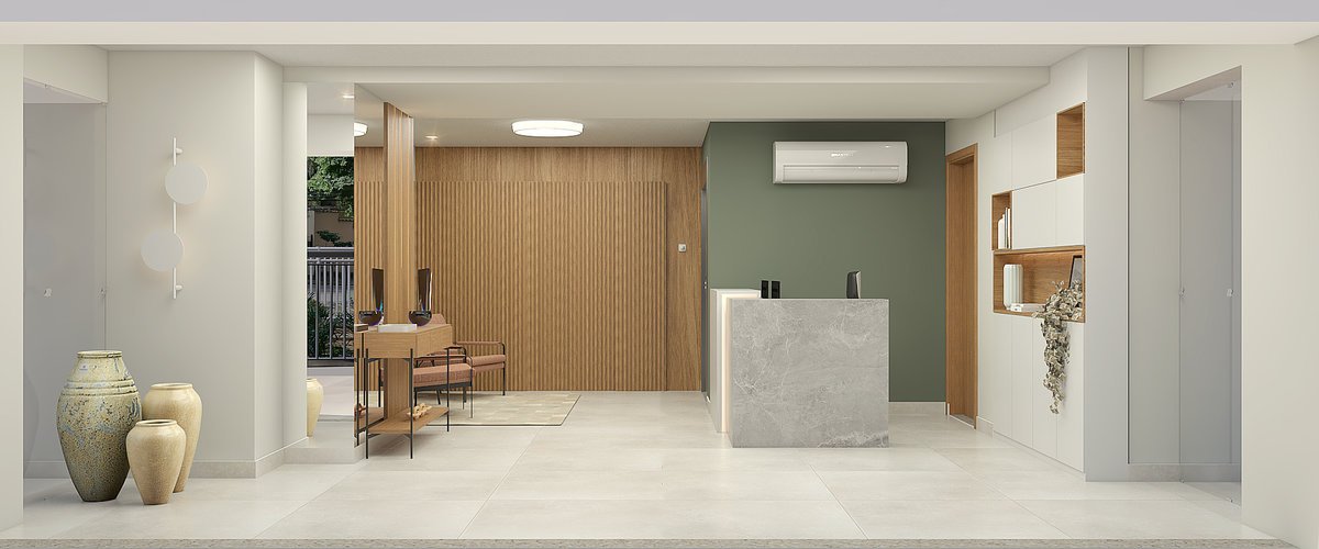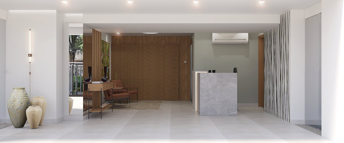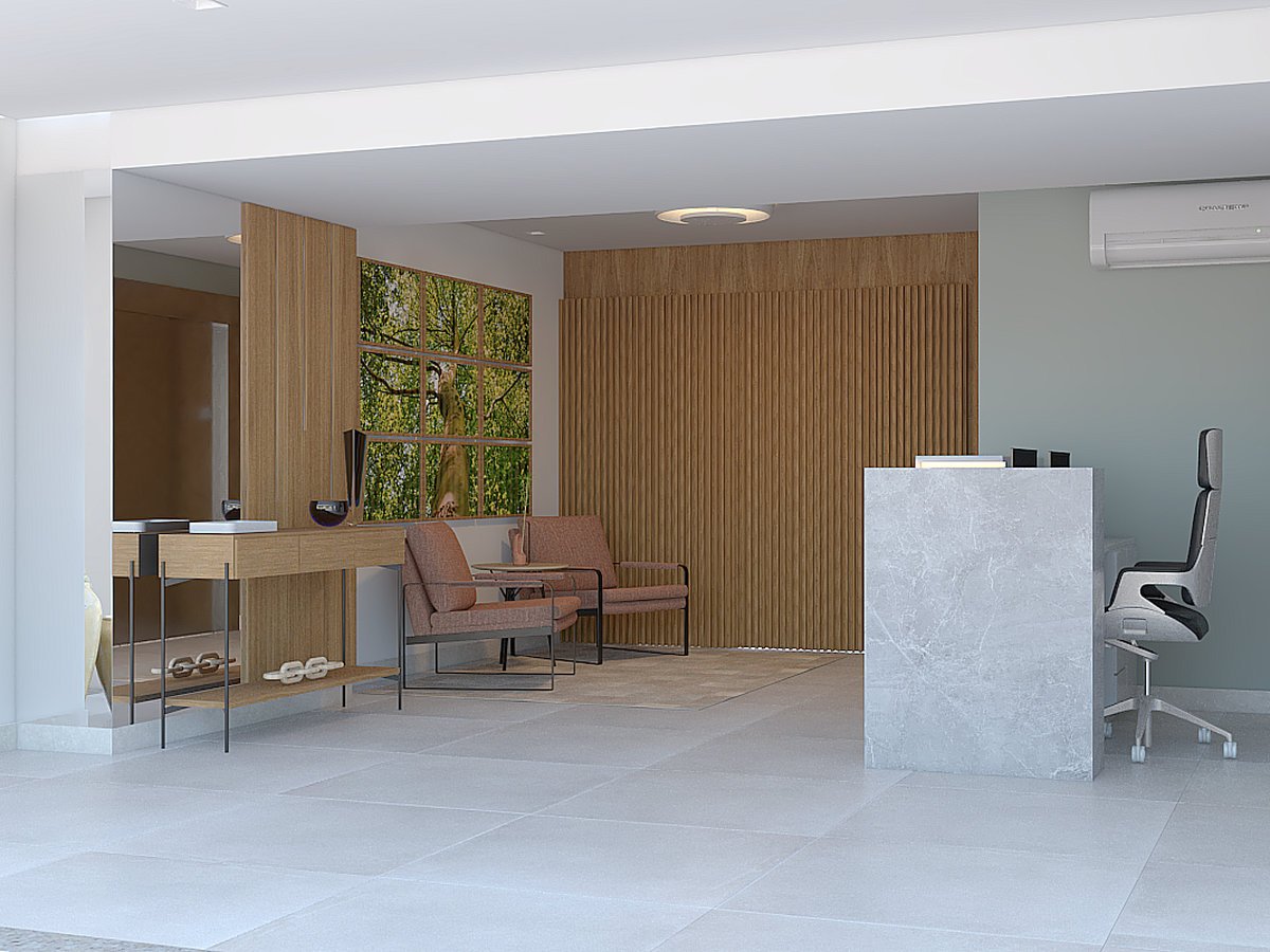 A nova portaria foi repensada para receber com mais calma e conexão. Quadros com cenas da natureza e materiais como madeira e pedra trazem acolhimento logo na entrada. A iluminação suave e o mobiliário confortável ajudam a transformar a espera em pausa. Tudo foi pensado para refletir bem-estar, leveza e pertencimento. Um convite sutil para respirar melhor já nos primeiros passos.